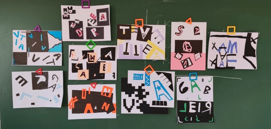Osmislili su kompozicije od slova svog imena, istražujući njihove oblike u pozitivu i negativu, u presjeku boja, u pokretu i odnosu. Uz kolaž papir, škare i ljepilo, slova su postala mnogo više od znaka – postala su slika, ritam, zvuk i priča o njima samima.