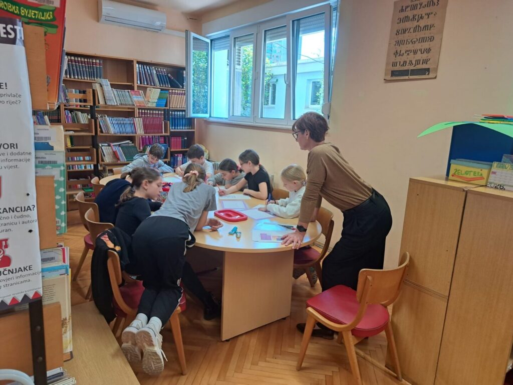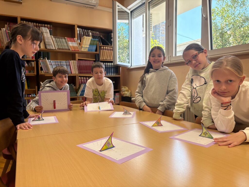Nakon rada na otvorenom, radionica se nastavila u školskoj knjižnici gdje su učenici izrađivali vlastite sunčane satove. Izrađene satove potom su ponovno testirali na igralištu, uspoređujući vrijeme koje pokazuje sjena sa stvarnim vremenom. U razgovoru su se dotaknuli i vremenskih zona te razloga odstupanja vremena.